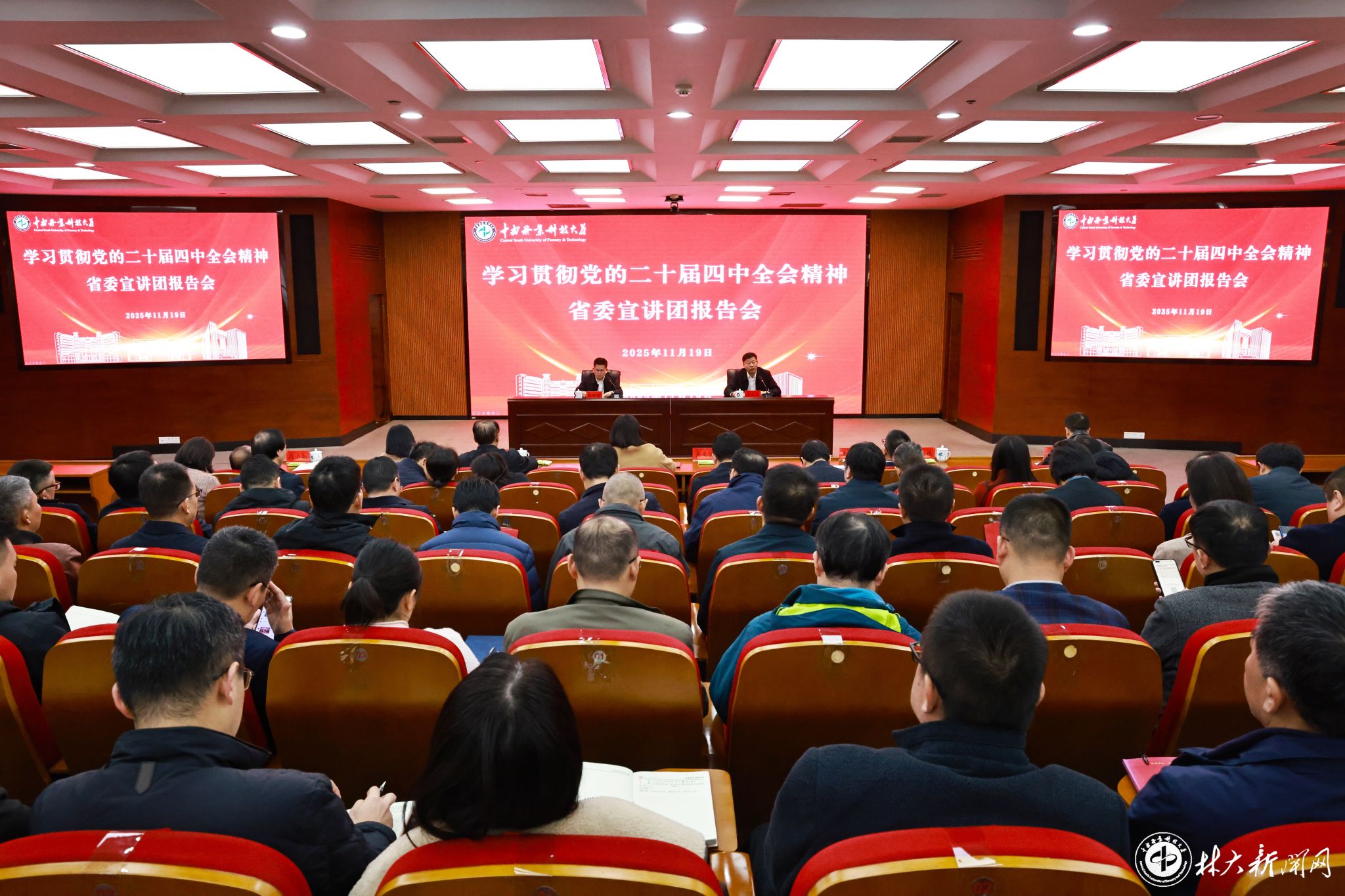 【林大网讯】(文/宣传统战部)11月19日上午,学习贯彻党的二十届四中全会精神省委宣讲团报告会暨学校党委理论学习中心组第11次集体学习(扩大)会议在博文楼立德厅举行。省委宣讲团成员、湖南工业大学副校长殷晓元作宣讲报告。学校党委书记吴义强院士主持会议,校长仇怡作总结讲话。全体校领导,全体处级实职干部、离退休老同志代表、党外人士代表、“两代表一委员”、思政课教师、辅导员及学生代表参加会议。