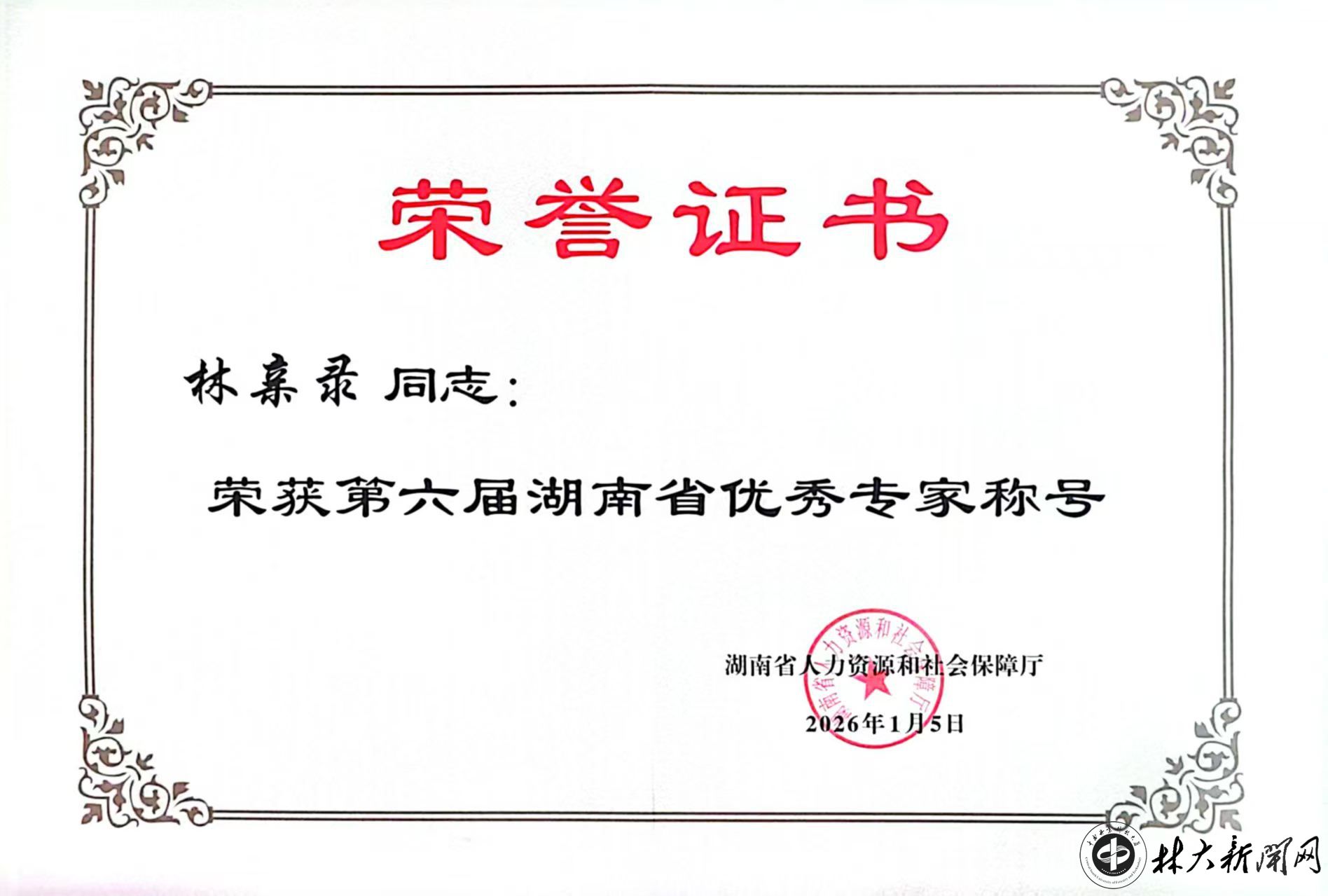 【林大网讯】(文/食品科学与工程学院)近日,全省人力资源和社会保障工作会议在长沙召开,会上公布了《关于表彰第六届湖南省优秀专家、第六届湖南省技能大师、第十三届湖南省技术能手和第一届湖南省乡村车间优秀企业家的决定》并进行集中表彰,副省长王俊寿出席会议并为获奖代表颁发荣誉证书。致公党党员、我校食品科学与工程学院林亲录教授被授予“湖南省优秀专家”称号。